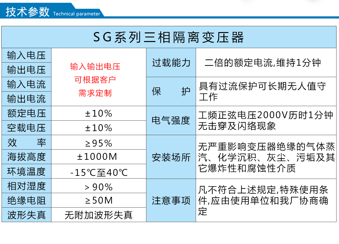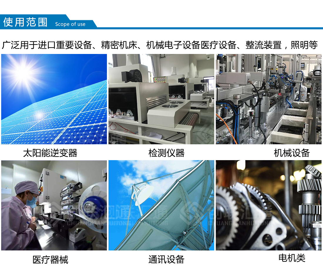 廣泛用于進(jìn)口重要設(shè)備、機(jī)密機(jī)床、機(jī)械電子設(shè)備、醫(yī)療設(shè)備、整流裝置、照明等,安裝場所應(yīng)無嚴(yán)重影響變壓器絕緣強(qiáng)度的氣體,蒸汽,化學(xué)性沉積,污垢,導(dǎo)電塵埃及無其他易爆易燃易腐蝕的物質(zhì)。