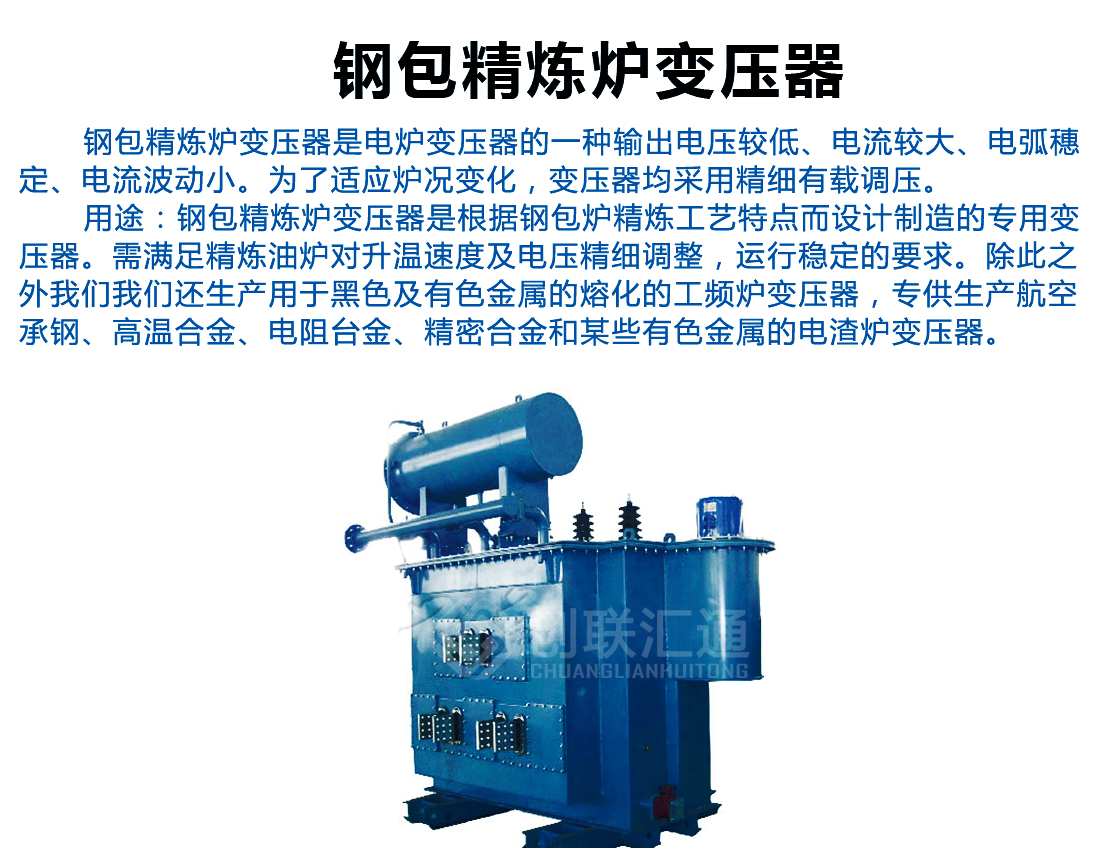 鋼包精煉爐變壓器是根據(jù)鋼包精煉工藝特點(diǎn)而設(shè)計(jì)、制造的專用變壓器,針對精煉爐對升溫速度及電壓精細(xì)調(diào)整、運(yùn)行穩(wěn)定的要求與之相對應(yīng)的設(shè)計(jì)原則,設(shè)計(jì)制造的爐用變壓器。鋼包精煉爐變壓器是電爐變壓器的其中一種,鋼包精煉爐變壓器輸出電壓較低、電流較大、電弧穩(wěn)定、電流波動小、為了適應(yīng)爐況變化采用有載調(diào)壓型較多。